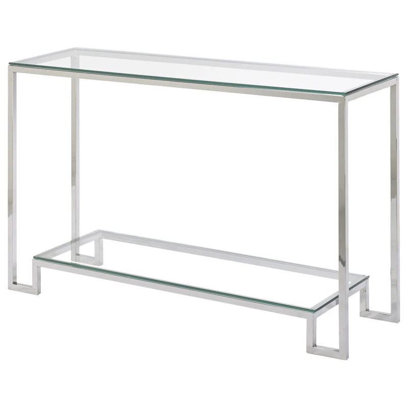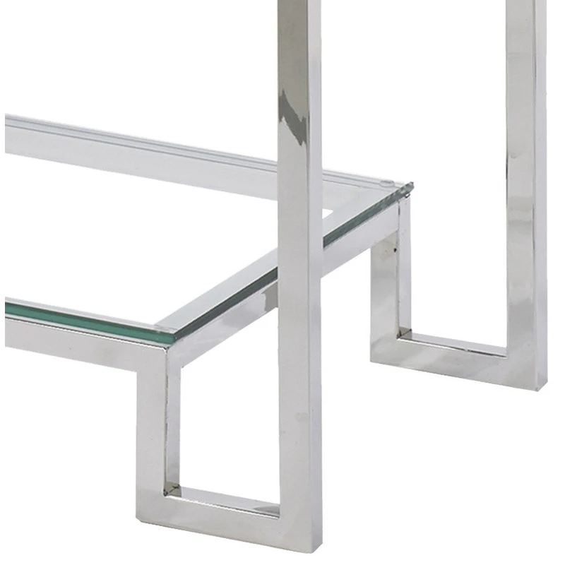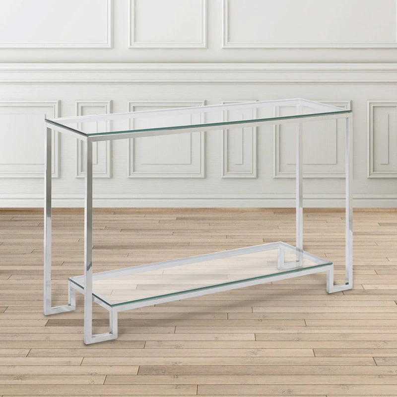 Chic modern glass Moniter console table with a lower glass shelf. The polished stainless steel table base with tempered glass top provides a clean, distinguished and refined addition to your home’s decor. Full size Moniter Console Table.
