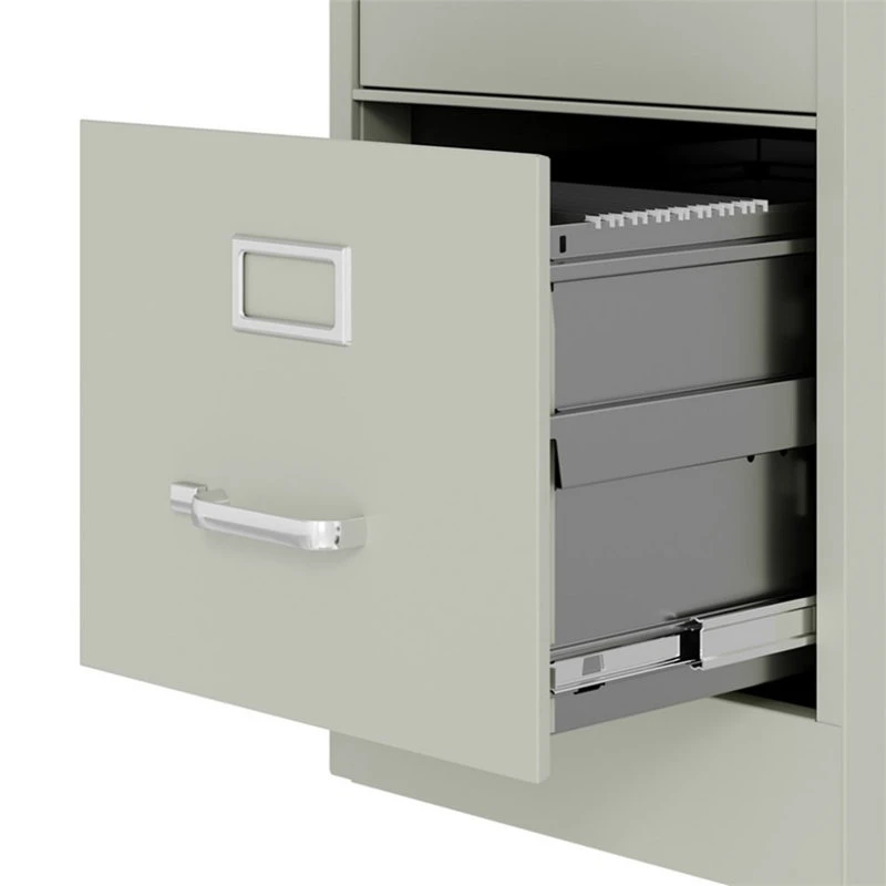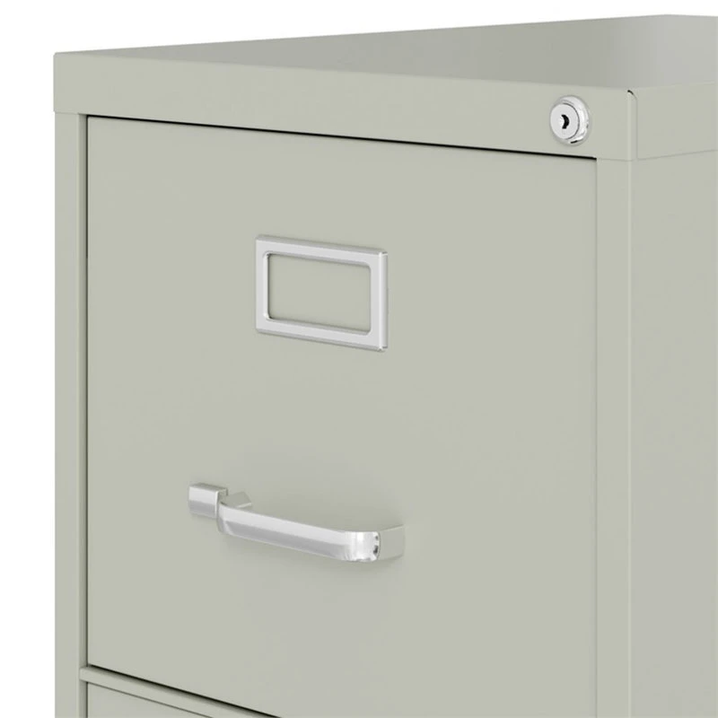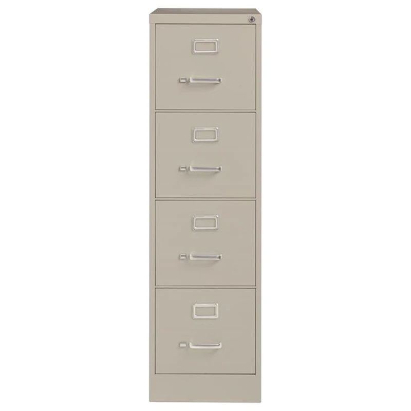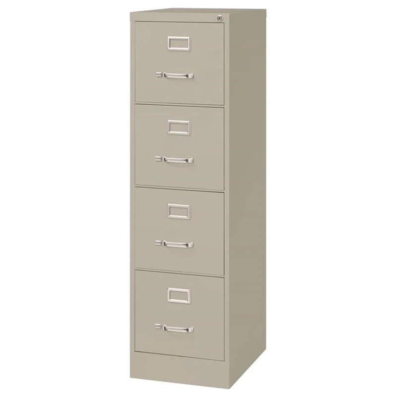 22-inch deep in Light gray four-drawer, letter width, commercial grade vertical steel file cabinets are perfect for business, educational, or personal offices. These cabinets feature a classic design and are constructed with high quality durable materials that are suitable for heavy-duty use. Ships fully assembled and is ready to accept letter width hanging file folders. Non-porous surface is easy to clean and disinfect. Each drawer includes 80% extension ball-bearing slides for smooth drawer action. Even fully loaded, these drawers open with ease. Adjustable follower wires keep files upright. The aluminum handles and label holder are durable and functional making it easy to access and label drawer contents. The included core-removable lock allows cabinets to be keyed alike. Designed to meet or exceed ANSI-BIFMA industry standards for performance and workmanship. Made with 28% total recycled content. Backed by a . TAA Compliant. Greenguard Gold certified for indoor air quality.