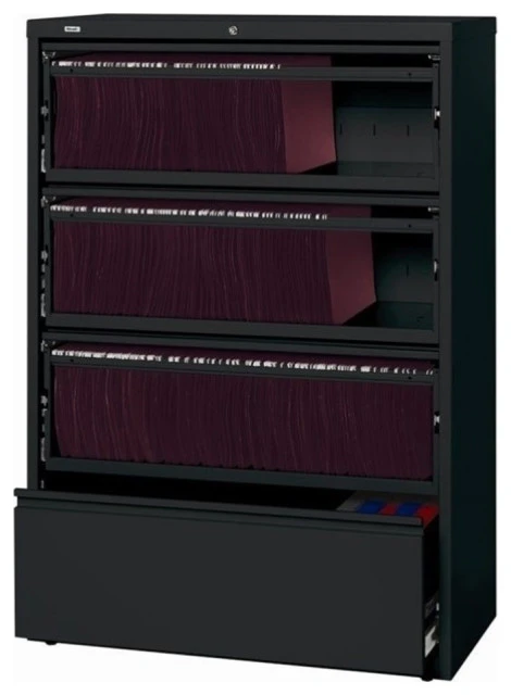 This 36 in. wide metal 4 drawer commercial grade lateral filing cabinet in Balck features three roll-out shelves and one standard drawer. Precision ball-bearing suspension allows for quiet use in your busy office environment. Fully assembled steel construction with reinforced base. Non-porous surface is easy to clean and disinfect. Interlock system prevents tipping by only allowing one drawer open at a time. Dual lock bars and core-removable lock come standard. Unit includes hang rails, magnetic label holders, and four adjustable leveling glides. Greenguard Gold certified for indoor air quality. Meets or exceeds ANSI/BIFMA standards. TAA compliant. .