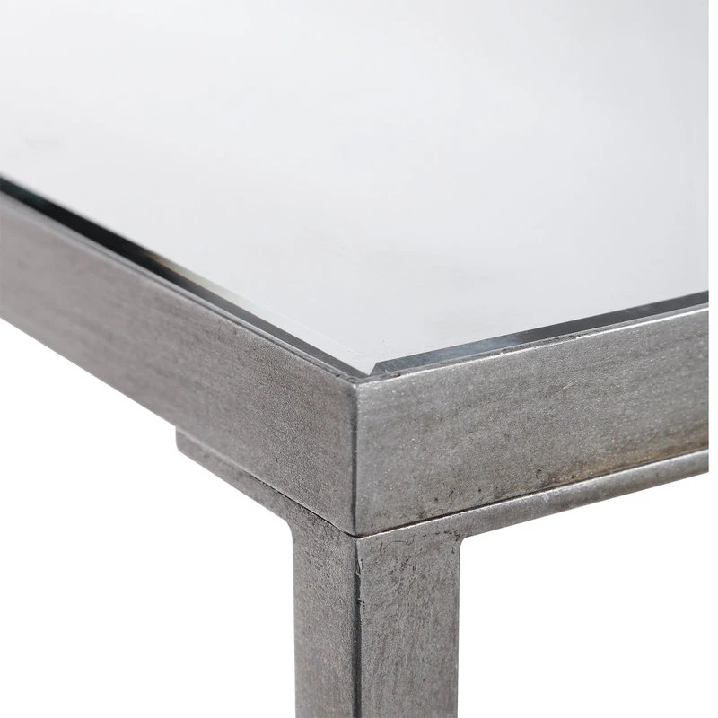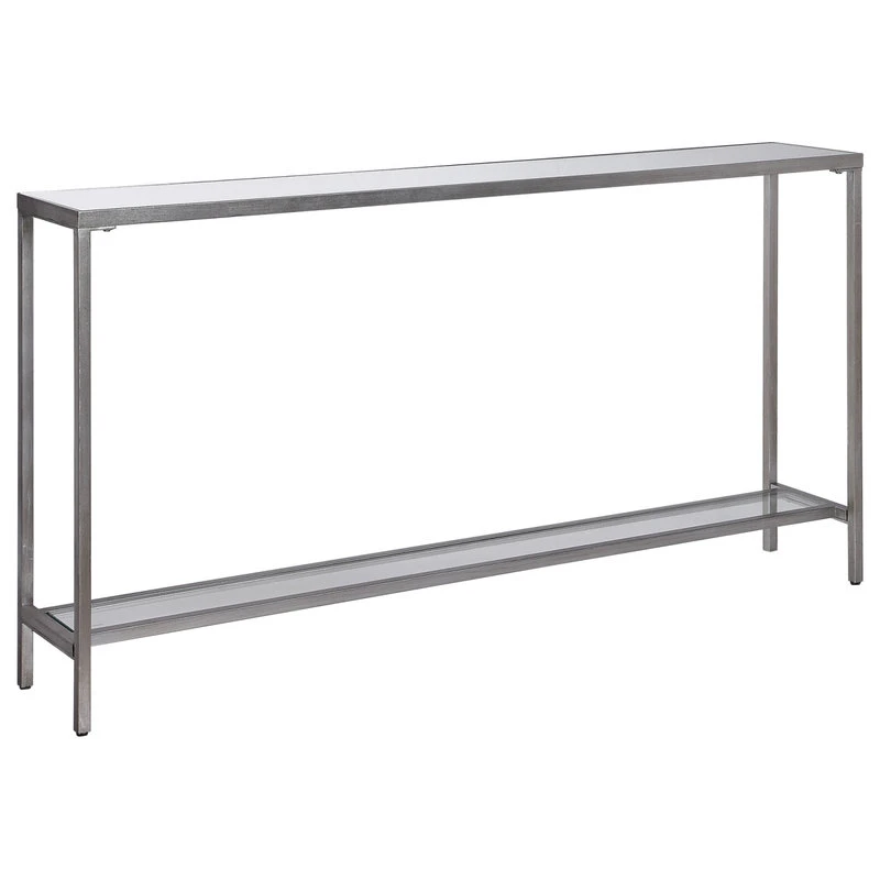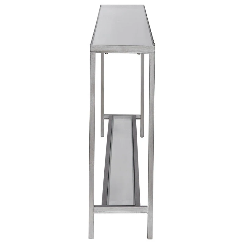 Classic And Minimalistic, This Narrow Iron Console Table Is Finished With Lightly Antiqued Silver Leaf, Inset With A Mirrored Top, And Gallery Shelf In Clear Glass.