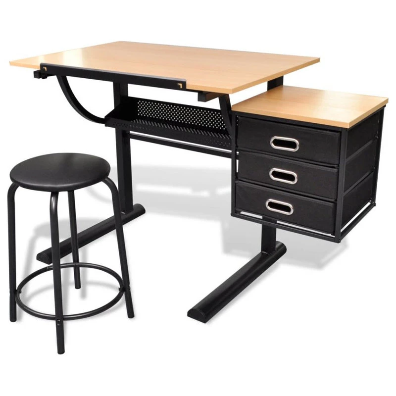 This drawing table, featuring a comfortable working space, will absolutely be a great helper to your drawing, writing, etc. This high-quality table, with tiltable tabletop, offers a lot of space for work, which makes it perfectly suitable for studying and technical drawing. The sheet stopper keeps paper on the table while the top is tilted. Our writing table also has three slide-out drawers for additional storage. The included stool is thickly padded to make you comfortable while working. The table is constructed from high quality MDF and supported by powder coated iron legs for durability, which will surely serve you many years.