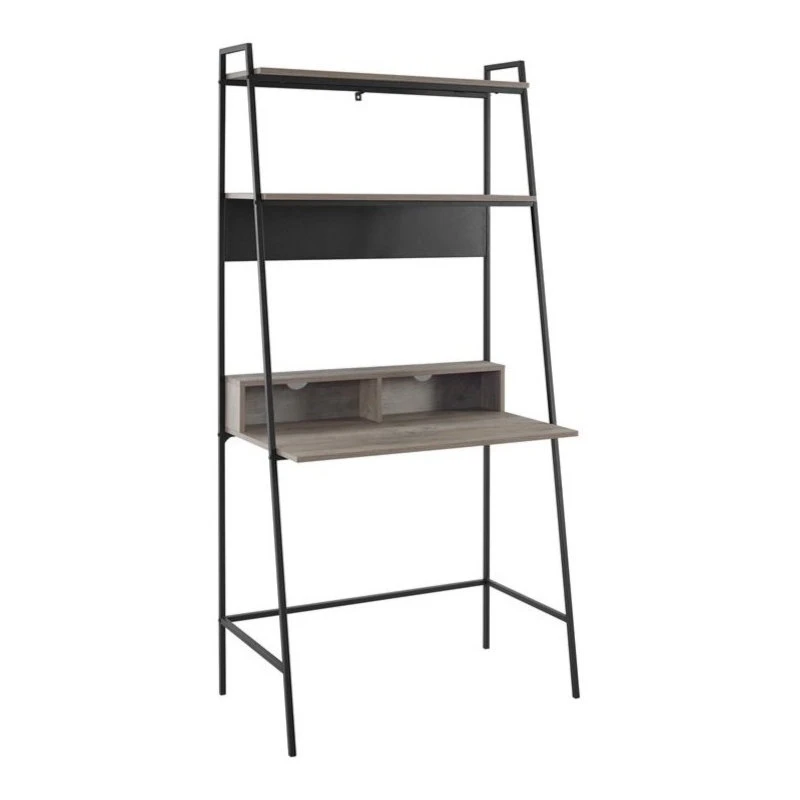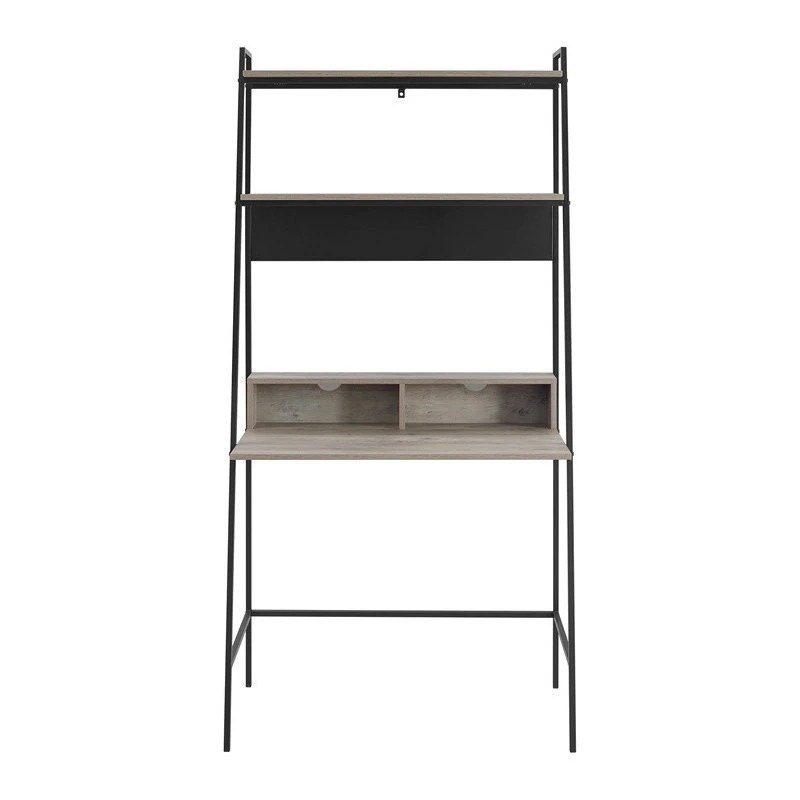 This ladder desk with bookshelf makes for a useful workspace in your home. Whether in your home office or your living room, this computer desk has all the space you need to keep your work essentials organized. With two open storage cubbies in front of the desk, cord management features to organize your electronic wires easily, two shelves above for books, and a metal magnet board for hanging up your calendar and family pictures. The table and shelves are made out of durable laminate with a flattering, wood grain appearance and the angled framing is made from metal in a ladder inspired design. This ladder desk makes an urban industrial statement with a mid century modern feel, for an overall stylish addition to your home.