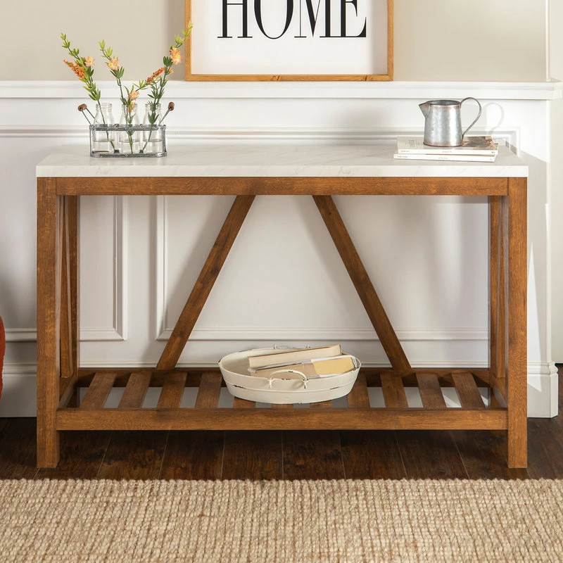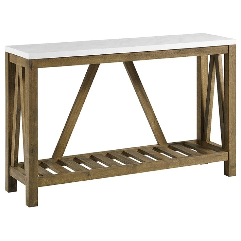 Rustic charm can be yours when you add this 52″ A-Frame console table to your living room, entryway, or hallway. The marble and walnut two-tone finish bring the perfect touch of aesthetic appeal while the spacious tabletop and open slatted bottom shelf provide the perfect place to display and store your favorite accessories, photos, and collectibles. Constructed of high-grade MDF and durable laminate, this piece will be the simple answer for all of your decorating needs.