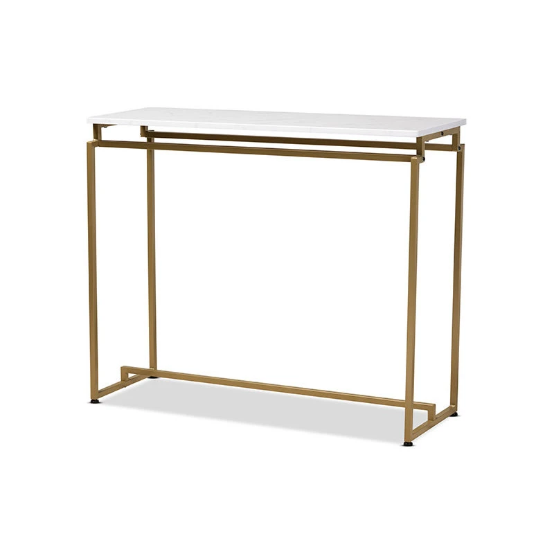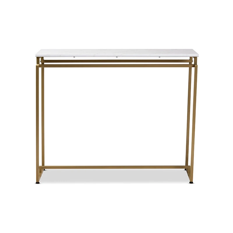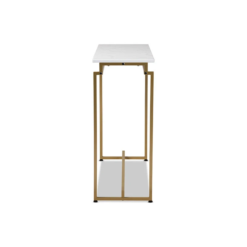 Baxton Studio Renzo Modern and Contemporary Brushed Gold Finished Metal Console Table with Faux Marble TabletopBaxton Studio Renzo Modern and Contemporary Brushed Gold Finished Metal Console Table with Faux Marble Tabletop-Cultivate a luxurious feel in your space with the Renzo console table. The Renzo features a stunning white faux marble tabletop that bears a striking resemblance to the genuine stone. The clean, sharp lines on the gold-finished frame convey a light, airy feel. Its slim silhouette makes it well suited for placement in the entryway or behind a sofa in the living room. The Renzo console table is made in China and requires assembly.