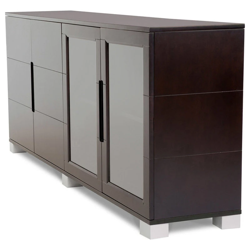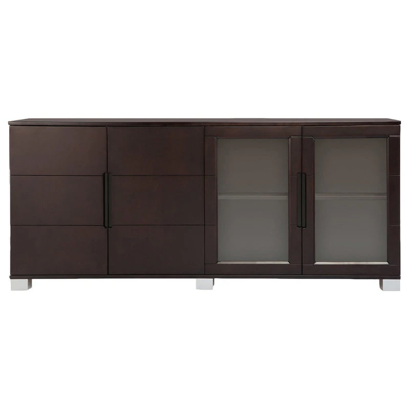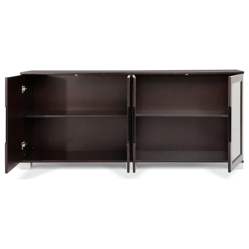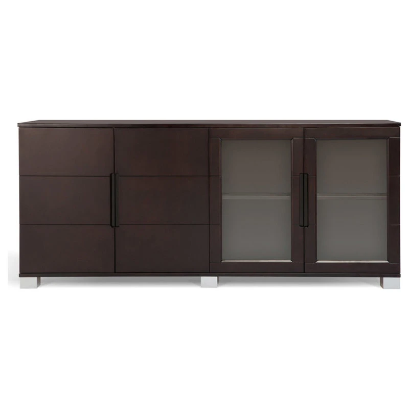 The Hayes modern cabinet is extremely versatile and may double as a credenza, contemporary storage unit or a buffet for any elegant living or office space. The spacious unit is divided into two double cabinets, one with solid doors and the other with clear glass doors framed in wood. Inside there are height adjustable shelves on either side. The dual sides are great for displaying books and keepsakes on one side while hiding extra paperwork or supplies behind the other. The finish is a smooth dark stained American walnut wood veneer with silver painted wood feet that coordinate perfectly with the Ford and other collections in dark walnut too. The suggested weight capacity is 815 lbs across the top and 214 lbs per shelf.