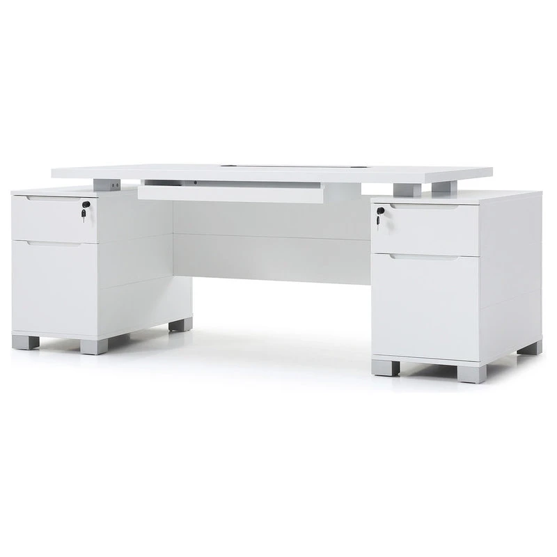 Stunning elegance and a floating desktop defines the elite 79-inch Ford Desk. The finish is a sleek matte white lacquer. This is accented with silver painted wood feet and risers plus a black panel on top with ports for wire management. It features four drawers with ball bearing slides for ample and effortless storage at your fingertips. Each pedestal features a dual lock with a top drawer for general storage and the lower drawer with filing that fits both letter and legal files. To finish it off there is a wide keyboard tray that can also double as a notepad storage.