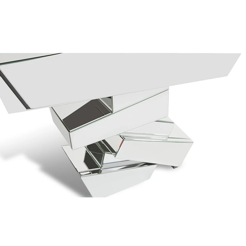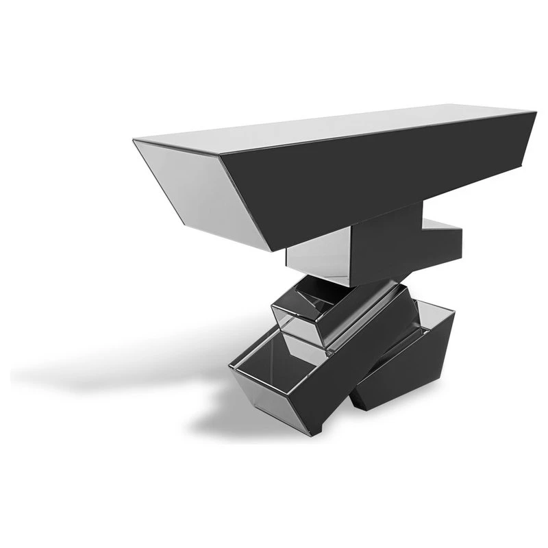 The Naxos Console Table is a unique combination of mirrored finish and sharp geometric angles. The reflective quality of this table gives it a personality all its own and is sure to be appreciated for years to come by those with discerning taste. The Naxos is a piece of artwork in itself and an ideal choice for showcasing a beautiful contemporary area rug.