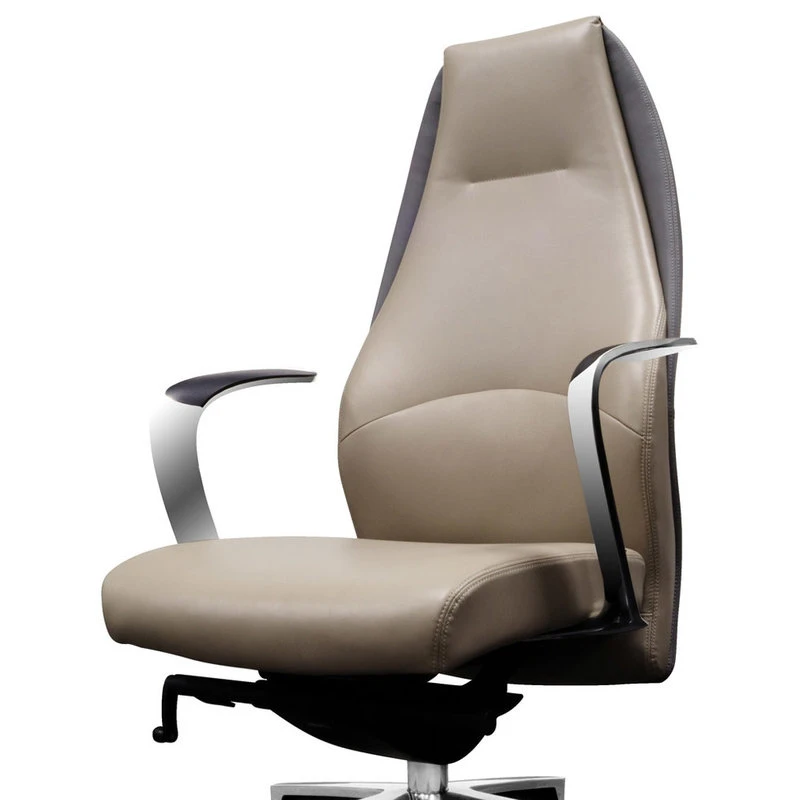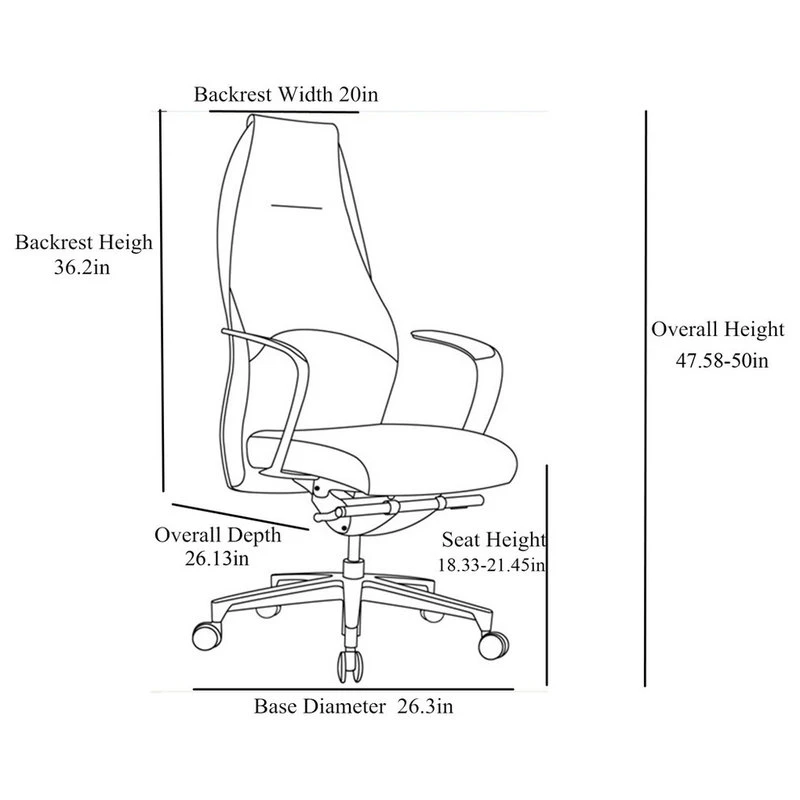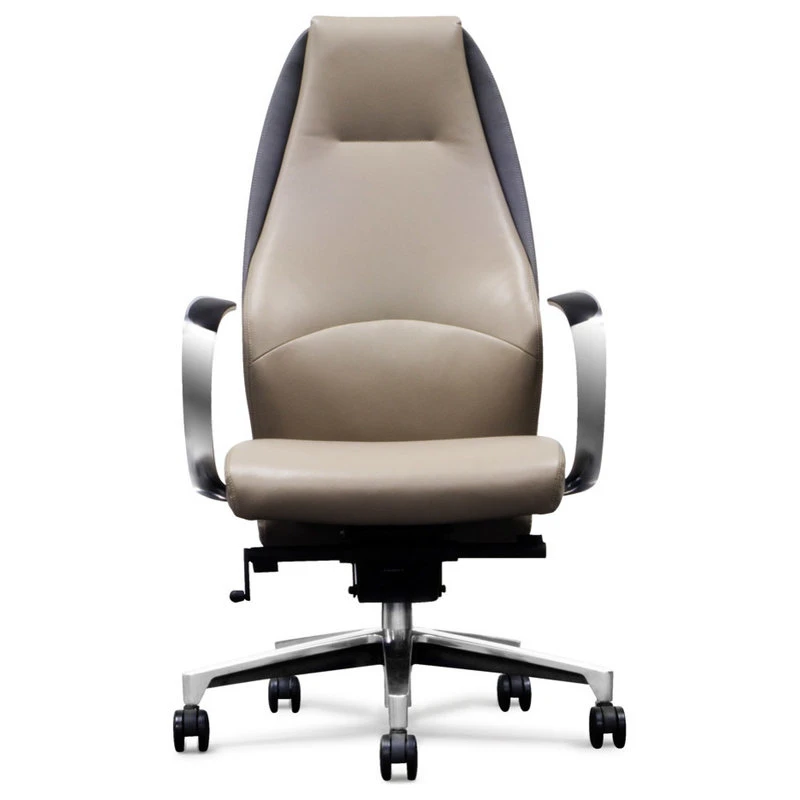 The Wrigley Leather Executive Chair is twice as nice with the unique two-tone styling and modern color combinations. It features luxurious genuine leather on the seat and backrest in one color and a contrasting color on the back in a high-quality leatherette. The base and floating armrests are made from polished aluminum with black plastic accents. The base includes a 360 degree swivel with 5 rolling caster wheels and a variety of adjustable options for added comfort. The seat is adjustable in a variety of ways including a standard gas lift height adjustment lever. The reclining function transitions from fully upright at 90 degrees and tilting all the way back to 120 degrees. You can also lock the reclining position so that it will only go back to a certain point and you don’t have to worry about reclining farther back than is desired. There is also a tension knob that adjusts the resistance when reclining that you can make looser or tighter depending on how easily you want to be able to engage the tilting. The knee-tilt mechanism is placed closer to the seat front which helps keep your feet on the floor while reclining mainly the backrest instead of the whole chair. This prevents the rocking chair effect and helps keep your feet on the ground while still increasing blood circulation and better spinal alignment. Let the graceful, curved lumbar support in our Wrigley executive office chair provide the ergonomic comfort give your office a handsome stylistic flair of professionalism. Available in dark brown with white accents, dark gray with black accents, light taupe gray with dark gray accents, or off-white with black accents. Suggested weight capacity is 418 pounds.